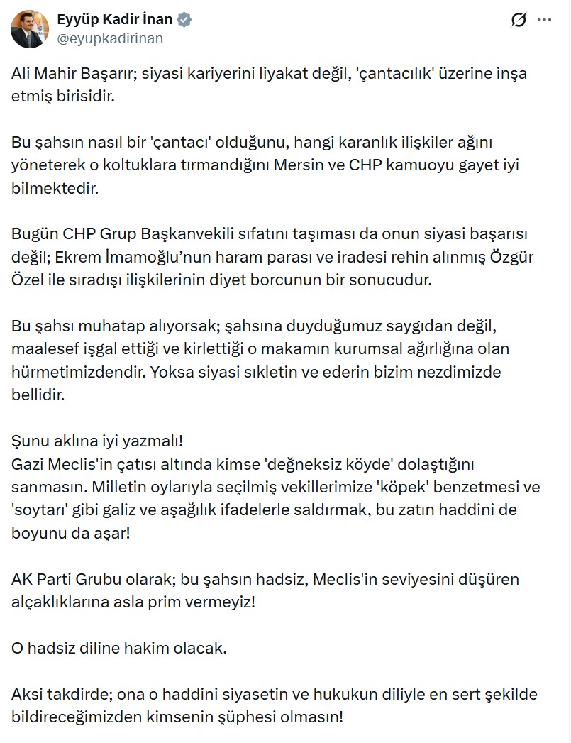 AK Parti Genel Sekreteri ve İzmir Milletvekili Eyyüp Kadir İnan, CHP Grup Başkanvekili Ali Mahir Başarır’ın açıklamalarına ilişkin yazılı bir değerlendirme yaptı. İnan, açıklamasında Ali Mahir Başarır’ın siyasi kariyerini liyakatle değil, “çantacılık” anlayışıyla inşa ettiğini savunarak, bu durumun Mersin’de ve CHP kamuoyunda bilindiğini ifade etti.