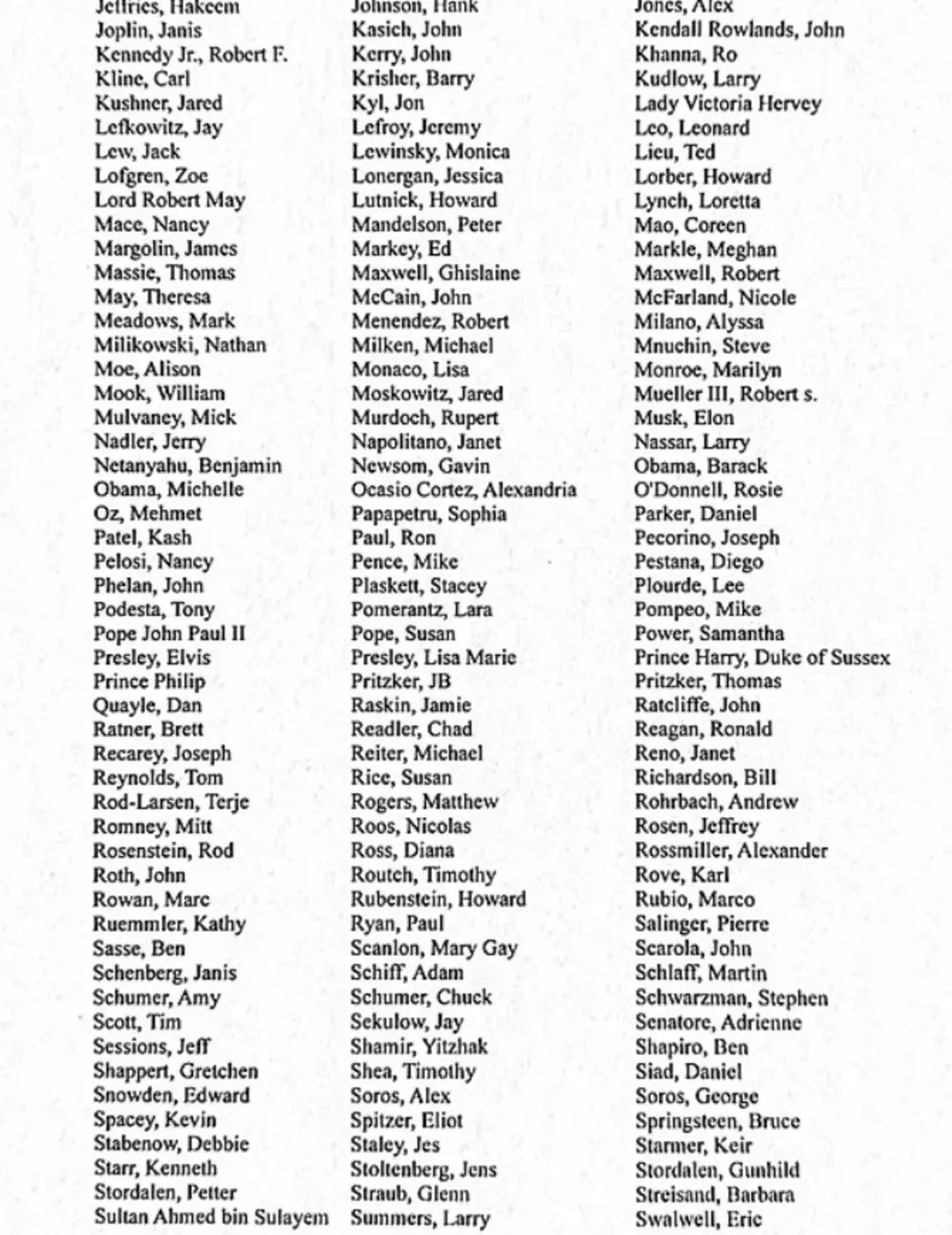 Belgelerde adı geçenler arasında müzik ve sinema dünyasından dikkat çeken isimler bulunuyor. Şarkıcı Beyoncé, rap sanatçısı Jay-Z, müzisyen Bruce Springsteen ve sanatçı Cher listede yer aldı. Hollywood’dan oyuncu Robert De Niro ile Sussex Düşesi olarak bilinen Meghan Markle da belgelerde isimleri geçenler arasında gösterildi. Siyaset dünyasından ise ABD Başkanı Donald Trump, Başkan Yardımcısı JD Vance, eski first lady Michelle Obama, senatör Marco Rubio, eski başkan Bill Clinton ve eski dışişleri bakanı Hillary Clinton da listede yer alan isimler arasında bulundu.