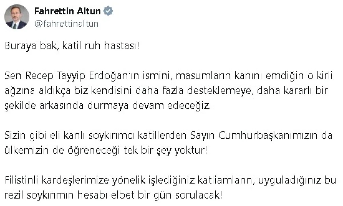 Kabinedeki varlığı, iftira ve yalan kusma saplantısından ibaret olan bu şahıs soykırımcı Netanyahu Hükümeti’nin hadsizlik ve arsızlık abidesidir.Cumhurbaşkanlığı İletişim Başkanı Fahrettin Altun, sosyal medya hesabından yaptığı açıklamada, İsrail Dışişleri Bakanı Yisrael Katz'ın Cumhurbaşkanı Recep Tayyip Erdoğan'a yönelik saldırgan paylaşımlarına sert bir tepki gösterdi."KATİL RUH HASTASI, ELİ KANLI SOYKIRIMCI"Altun, şu ifadeleri kullandı:Katil ruh hastası! Sen Recep Tayyip Erdoğan’ın ismini, masumların kanını emdiğin o kirli ağzına aldıkça biz kendisini daha fazla desteklemeye, daha kararlı bir şekilde arkasında durmaya devam edeceğiz. Sizin gibi eli kanlı soykırımcı katillerden Sayın Cumhurbaşkanımızın da ülkemizin de öğreneceği tek bir şey yoktur.