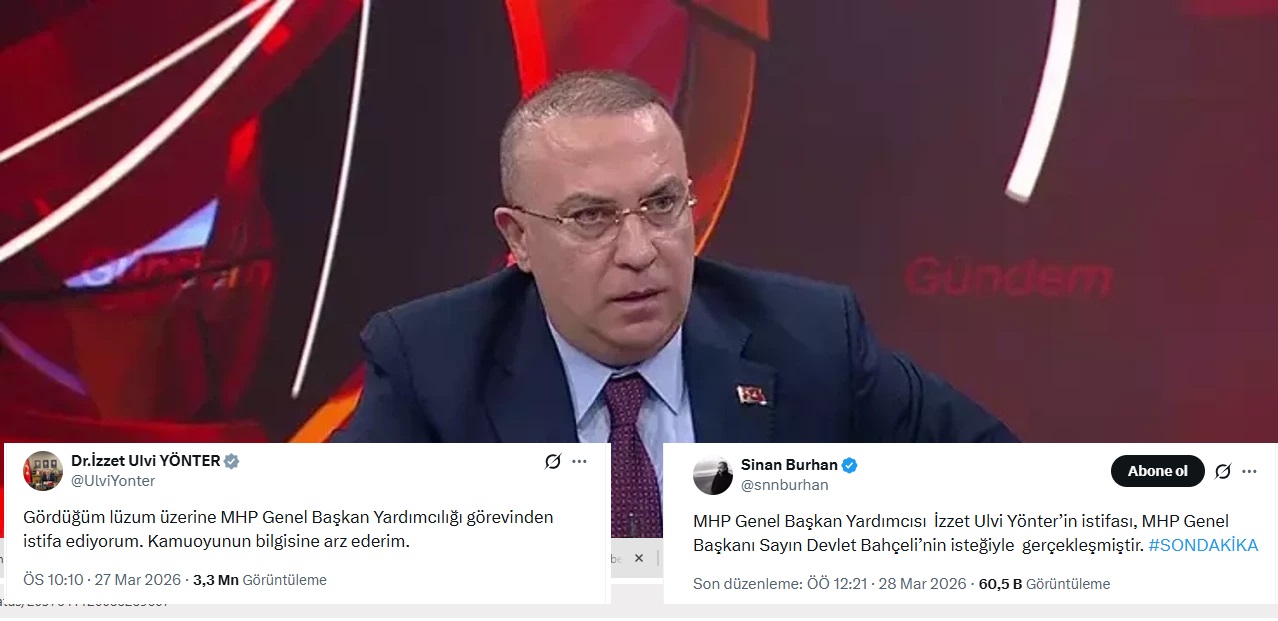 illiyetçi Hareket Partisi (MHP) Genel Başkan Yardımcısı İzzet Ulvi Yönter, sosyal medya hesabı üzerinden yaptığı açıklamayla görevinden istifa ettiğini bildirdi.Milliyetçi Hareket Partisi (MHP) Genel Başkan Yardımcısı İzzet Ulvi Yönter, görevinden ayrıldığını bildirdi.