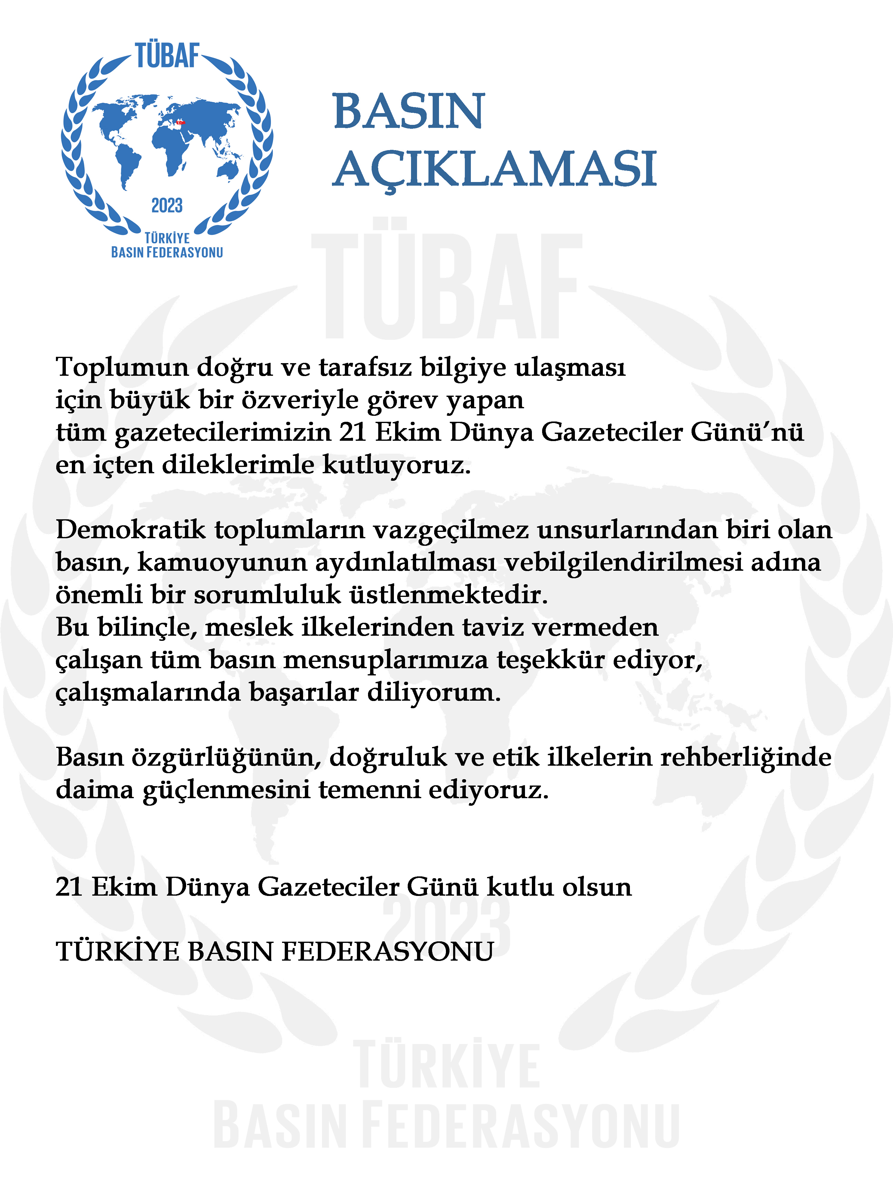 Türkiye Basın Federasyonu (TÜBAF) 21 Ekim Dünya Gazeteciler Günü mesajı;